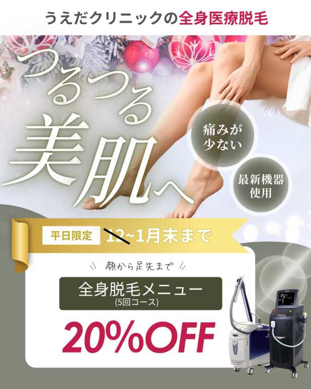 12・1月のおすすめプラン event_note2025.12.22 🎁年末年始のオススメプラン🎁 12月~1月末までのご契約で 全身脱毛5回コースが 男性女性ともに 平日限定20%オフ🌟 露出の少ない冬の間に 全身脱毛でつるつる肌を目指しませんか😊 無料カウンセリングはこちら うえだクリニック 090-8887-3303